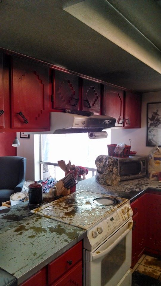 The fire damage was localized to over the stove; the rest was just smoke and soot they had to cleanup in the adjoining 4 rooms. (The laundry is my problem, and it's taking several washes with vinegar to get the smell out. I'll be at it for a week, I'm guessing.)