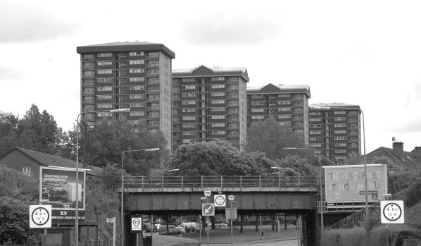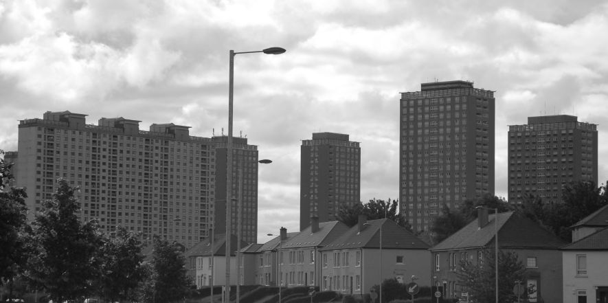 The 3-pronged tower on the left is the clock tower of a, now closed, hospital called Ruchill. There are 4 wards left on the site, which are regular targets for local vandals and assorted neds.