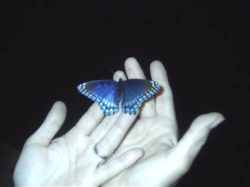 Isabel is coming so we battened down the hatches late last night...removed all the lawn ornament projectiles, etc...stood back on the patio to look around one last time...she flew at me from the darkness and fell to the ground...I leaned down and touched her wings...she didn't fly away, but fluttered her wings as if I were petting her and she liked my attention...I braved the the fear of her flight and gently pushed my hand under her delicate legs and let he walk into my hand...I pleaded with my husband to run for the camera...he said her wings must be wet from the night dew and she came to the light to dry off...she liked when I held her up to the light...I could tell cause her wings would fan and fluff...