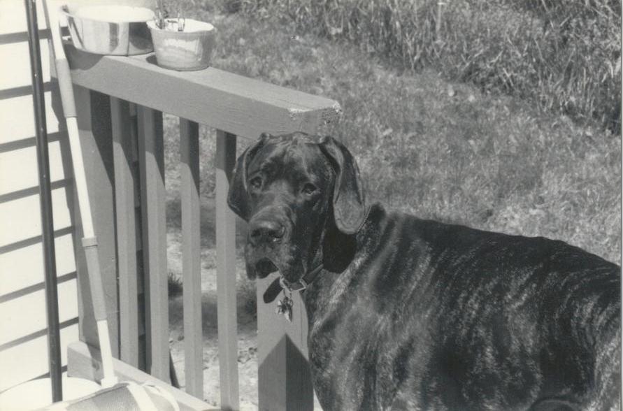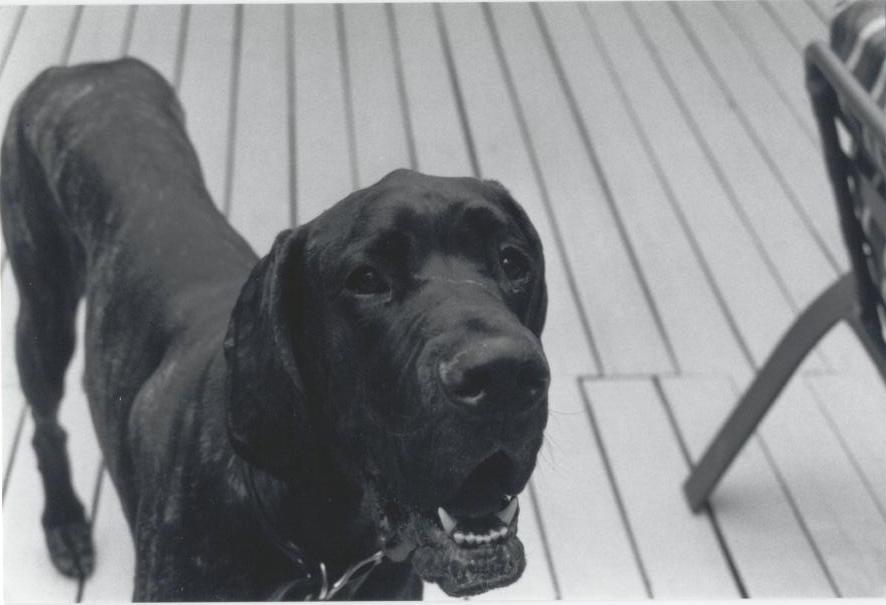 mick is a great dane (dark brindle colored), squid is a german short-haired pointer (hes brown/gray, instead of brown/white...i think its called "Roan").
