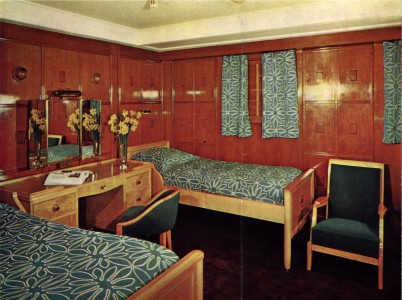 Once in his cabin he unpacks his things for the voyage. While placing his things in the closet he hears a odd sound from the next cabin. He places his head by the joining door to the cabin. What is that sound? No it couldn't be? The last time he heard that sound was back in Paris while on leave. Ah! What was her name again? He ponders. Thats right, Fefe! He smiles as he remembers. He takes a long hot bath and dresses for dinner.