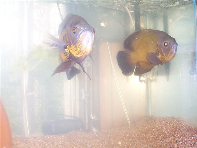 Here are 2 of my oscars, Lil bit and bulldog. They are in a tiny tank in this pic, ,there normal home is a 90-gallon tank. They lay eggs every other day, lol, but no babies yet. Maybe soon.