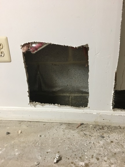 And then, looking at the inside basement wall from left to right, the original drywall hole, to determine where the water was getting into the basement from: