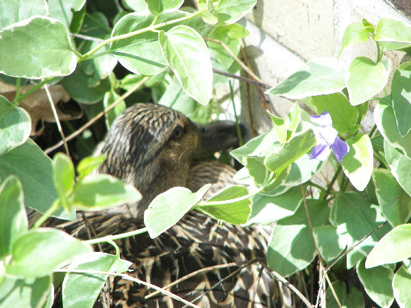 No we don't. We heard her when she was laying but didn't try to see until afterwards and she was sitting on the eggs then. I'm anxious for when they hatch to see how many. The mama duck seems so serene on her nest.