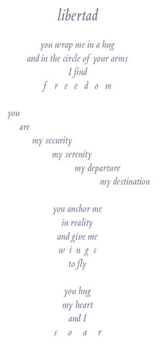 I'm posting another of my poems in hopes of eliciting more of your Haikus in return. This one is in graphic format, as I think the formatting is integral to the piece, and I can't preserve that well enough on here. The poem is called 'libertad'.
