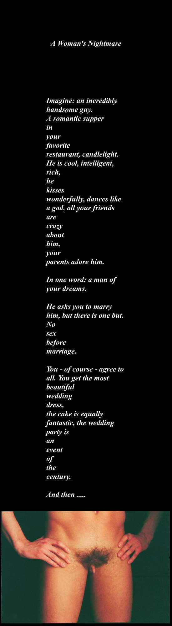 "I blame my mother for my poor sex life. All she told me was, 'the man goes on top and the woman underneath'. For three years my husband and I slept on bunk beds."