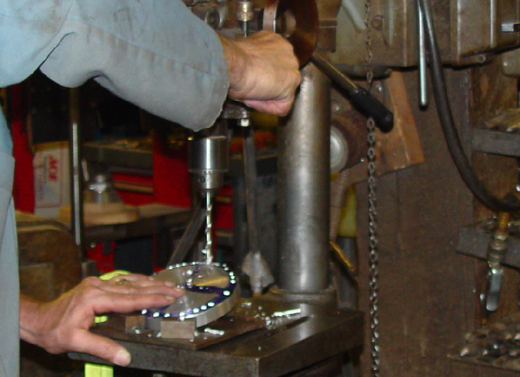 Last year I made sketches of the circular base that would always allow equal spacing for any number of national flags up to 8. With a dividing head I layed out the part and made a simple centering fixture for the drilling. The center hole was drilled and tapped for the standard used by the trophy industry if an elevated centerpiece is ever added.