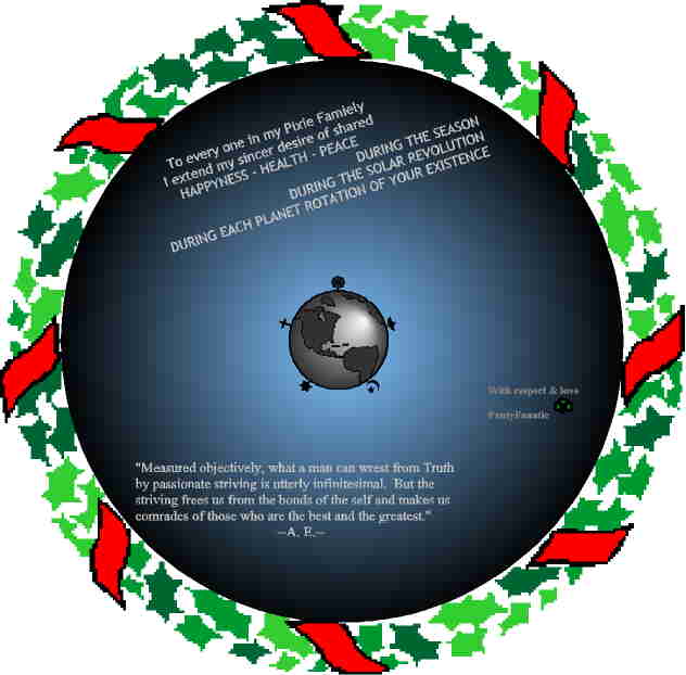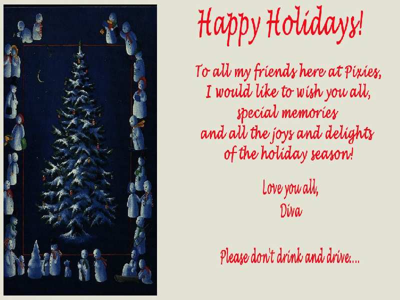 I want to extend my Best Wishes and Seasons Greetings to all of you here at PIXIES. Have a safe Holiday Season and PLEASE come back to your extended family Safe and Sound!!!!