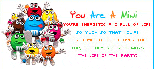 Too bad there isn't a pink one, but i came out to be the yellow one!!~~~You may be a little simple. but you always see the goo in situations and are great at cheering people up! So which M&M are you?